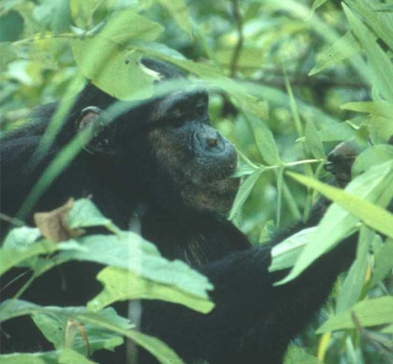 Рисунок 1: Шимпанзе используют растения ради их лечебных свойств. Здесь особь сгибает и глотает целые листья Aspilia mossambicensis, одного из более чем 40 потребляемых видов, которые, как было показано, физически очищают человекообразных африканских обезьян от кишечных глистов (Huffman et al., 1997).